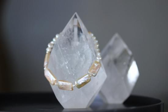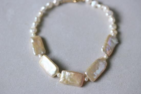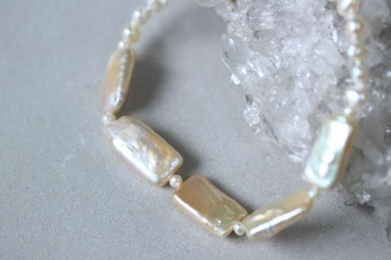スクエアシェイプとフラットポテト淡水パールのブレスレットです。