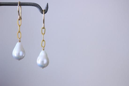 ぽってりとしたドロップの淡水パールと存在感のあるチェーンとのピアスです。