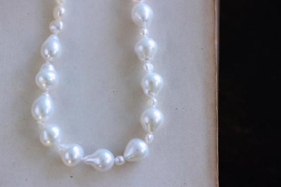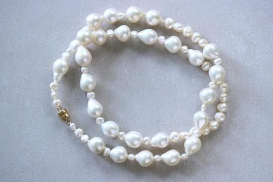 ぽってりとしたドロップの淡水パールと、大き目、小さめのフラットパールの